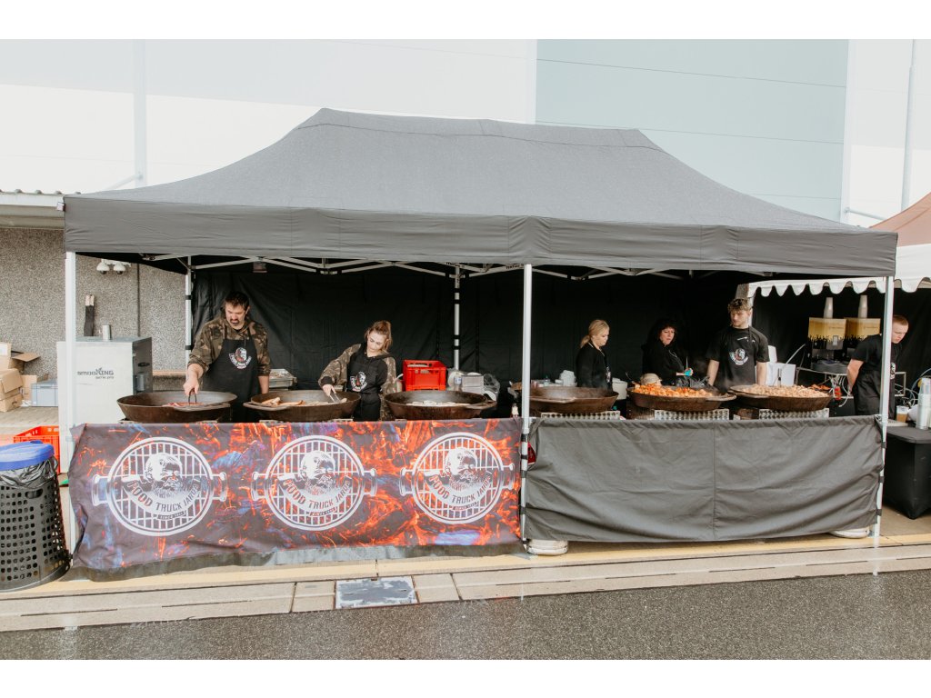 Pronájem malého nůžkového párty stanu v černé barvě pro venkovní použití. Perfektní volba pro akce pod širým nebem.