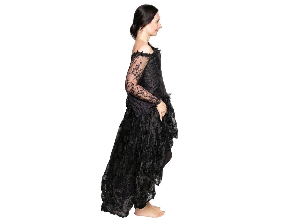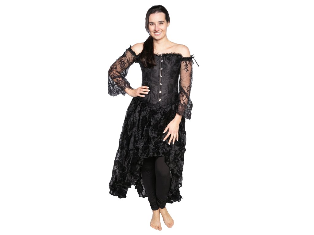 Kostým Gotička je vyroben z kvalitních materiálů, které jsou odolné, lehké a příjemné na dotek. Černá sukně s korzetem s krásnými detaily jsou navrženy tak, aby padly perfektně a poskytovaly maximální pohodlí během nošení.